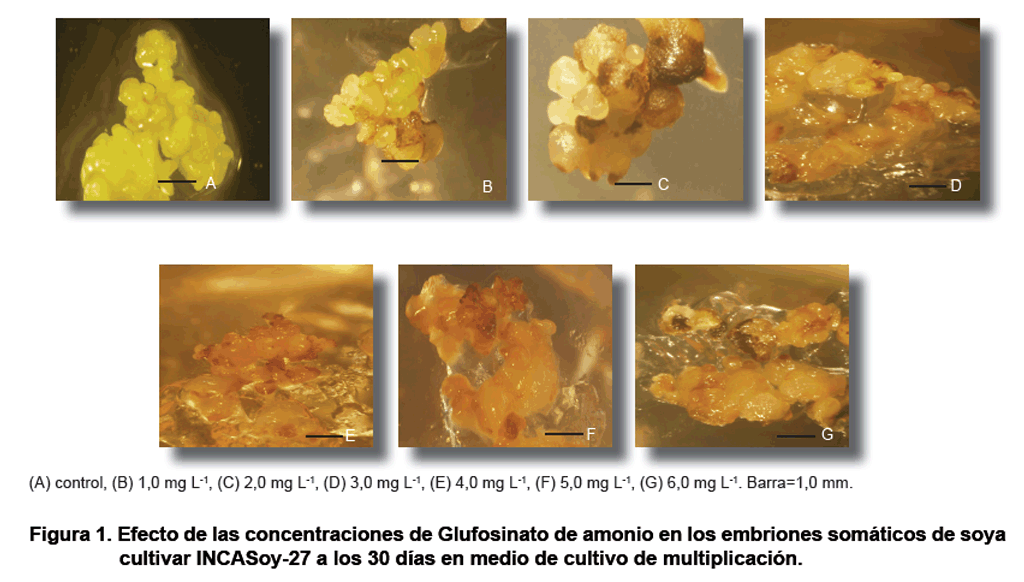 Se determinó la concentración mínima inhibitoria de Glufosinato de amonio 4,0 mg L-1, en medio de cultivo semisólido, requerida para su empleo como agente selectivo en la transformación genética de embriones somáticos de soya cultivar INCASoy-27.