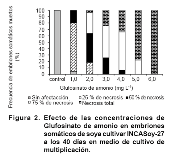 El establecimiento de un programa de transformación genética de plantas requiere de un sistema de selección in vitro de los tejidos transformados. En el género Glycine existen pocas referencias que emplean el Glufosinato de amonio como agente selectivo de embriones somáticos transformados. Por ello, este trabajo tuvo como objetivo determinar la concentración mínima letal del herbicida Glufosinato de amonio en embriones somáticos de soya cultivar cubano INCASoy-27, para usarlo como agente selectivo en programas de transformación genética. Los embriones somáticos fueron colocados en medio de cultivo de multiplicación con 20 mg L-1 de ácido 2,4-diclorofenoxiacético y diferentes concentraciones de Glufosinato de amonio (1,0; 2,0; 3,0; 4,0; 5,0; 6,0 mg L-1). Todas las concentraciones del agente selectivo causaron necrosis en embriones somáticos no transformados de soya. El incremento de la concentración del agente selectivo y el tiempo de cultivo, aumentó la necrosis de los embriones somáticos. Finalmente se determinó la concentración mínima letal de Glufosinato de amonio 6,0 mg L-1, en medio de cultivo semisólido, requerida para su empleo como agente selectivo en la transformación genética de embriones somáticos de soya cultivar INCASoy-27.