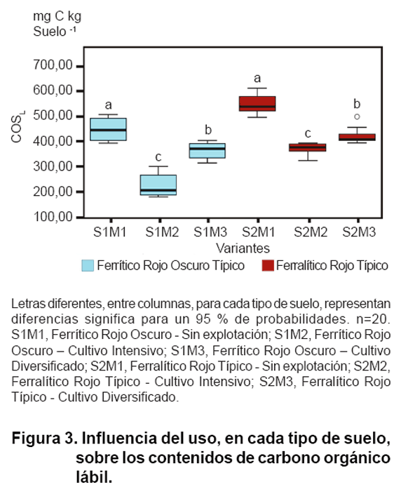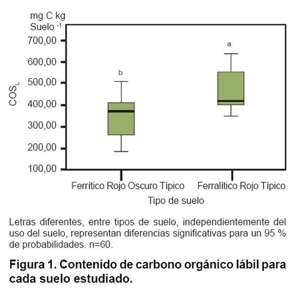 The soil organic matter is an essential component in the reserve and carbon cycle. The carbon in the soil is incorporated to the continuous contribution of organic material in natural conditions, however, the land´s practice generates the organic carbon decrease while sustainable practices of land use contributes to its capture and accumulation. A frequent practice for evaluating changes of the organic matter quality under different managements is the determination of labile fractions of soil organic carbon. The content of Labile Soil Organic Carbon (COSL) was compared on the soil layer 0-20 cm of a soil Ferralítico Rojo Típico from Ciego de Ávila with a Ferrítico Rojo Oscuro from Camagüey were undergone to three uses of the soil: Without exploitation, diversified and intensive crop cultivation. COSL extraction was performed by oxidation with potassium permanganate (0,02 mg L-1) and the determination was made by colorimetry. Independently the use, the content of COSL is higher on the Ferralític soil than on the Ferrítico one but in both the contents decreased in the areas under intensive cultivation in relation to the ones without any exploitation. In addition to this, in the diversified systems, based on Lands Sustainable Management, this indicator tends to recover. These results suggest the inclusion of the determination of the COSL, as an alert indicator on how the soil´s uses affect the quality of them.