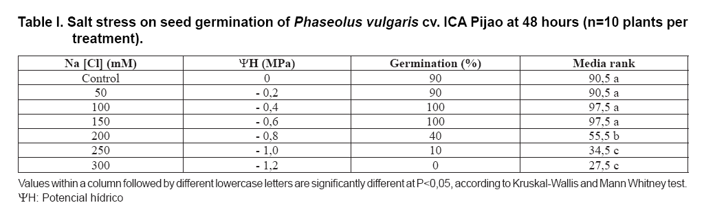Common bean (Phaseolus vulgaris L.) is an important food legume worldwide. Salinity induces losses in common bean yield, particularly in arid, semiarid and in non-irrigated areas. The objective of this study was focused on determining effects of salt stress on seed germination and seedling growth of Phaseolus vulgaris. The common black bean cv. ICA Pijao was used as plant material. Salt stress was induced putting the seeds of this crop in different solutions of NaCl: 50, 100, 150, 200, 250 and 300 mM and deionized sterile water was used like control. The results showed that salinity stress reduced both seed germination and seedlings growth at salt concentrations above 150 mM. Consequently, results strengthen the role of NaCl as a stress- inducing factor, and also the susceptibility of common bean to salinity. Parameters evaluated in this work may provide new criteria to support in vitro selection in common bean breeding programs to find salt stress tolerant genotypes.
