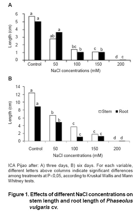 The present study confirms that Phaseolus vulgaris is susceptible to high concentrations of NaCl. The results showed that salinity stress reduced both seed germination and seedlings growth at salt concentrations above 150 mM. This variables may be used to find salt stress resistance genotypes in vitro culture, but more parameters like water content, fresh and dry weight, photosynthesis activity, phytotoxicity, should be studied for have a better criteria in the plant selection.