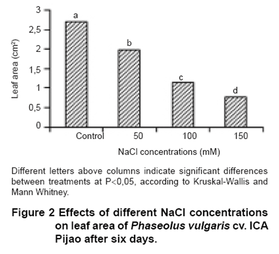 Leaf area of Phaseolus vulgaris cv. ICA Pijao after six days was significantly