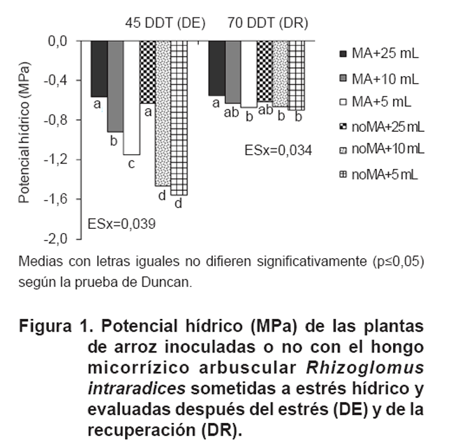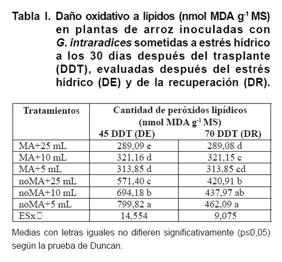 Se estima que la población mundial continúe en ascenso; sin embargo, el recurso hídrico disponible para enfrentar las cosechas en estos momentos no es suficiente, es por ello que se trabaja en buscar alternativas que ahorren agua y mantengan o incrementen los rendimientos en los cultivos agrícolas. El uso de los hongos micorrízicos arbusculares (HMA) es sin lugar a dudas, una vía que contribuye a tales propósitos. La investigación se realizó en la Estación Experimental del Zaidín, Granada, España, en macetas plásticas, con plantas de arroz micorrizadas y no micorrizadas, en condiciones semi-controladas, con tres suministros de agua, sin estrés (25 mL), estrés moderado (10 mL) y estrés intenso (5 mL), durante 15 días, con el objetivo de evaluar el efecto de la inoculación de Rhizoglomus intraradices en plantas de arroz sometidas a estrés hídrico y después de recuperadas, en algunas variables bioquímicas. Los resultados mostraron que la simbiosis HMA reduce la acumulación de peróxido de hidrógeno y el daño oxidativo a los lípidos a partir de un incremento en la acumulación del antioxidante glutatión. Estos efectos combinados mejoraron el metabolismo de plantas después de un periodo de estrés hídrico y se pueden sugerir como indicadores ante condiciones de déficit hídrico en plantas de arroz micorrizadas.