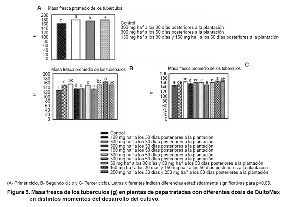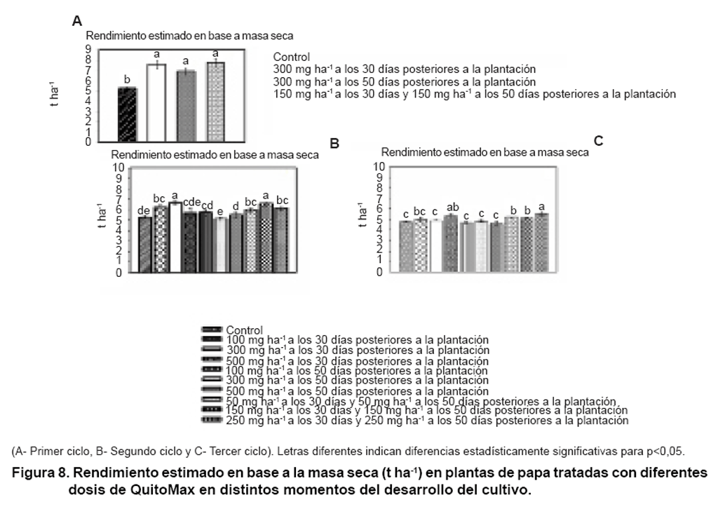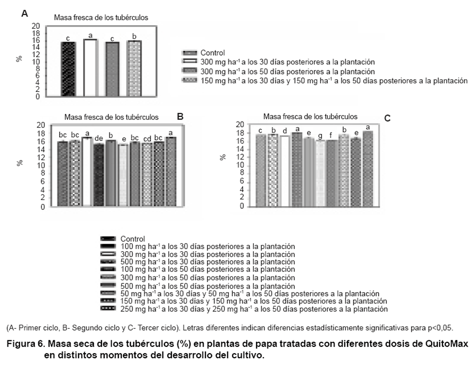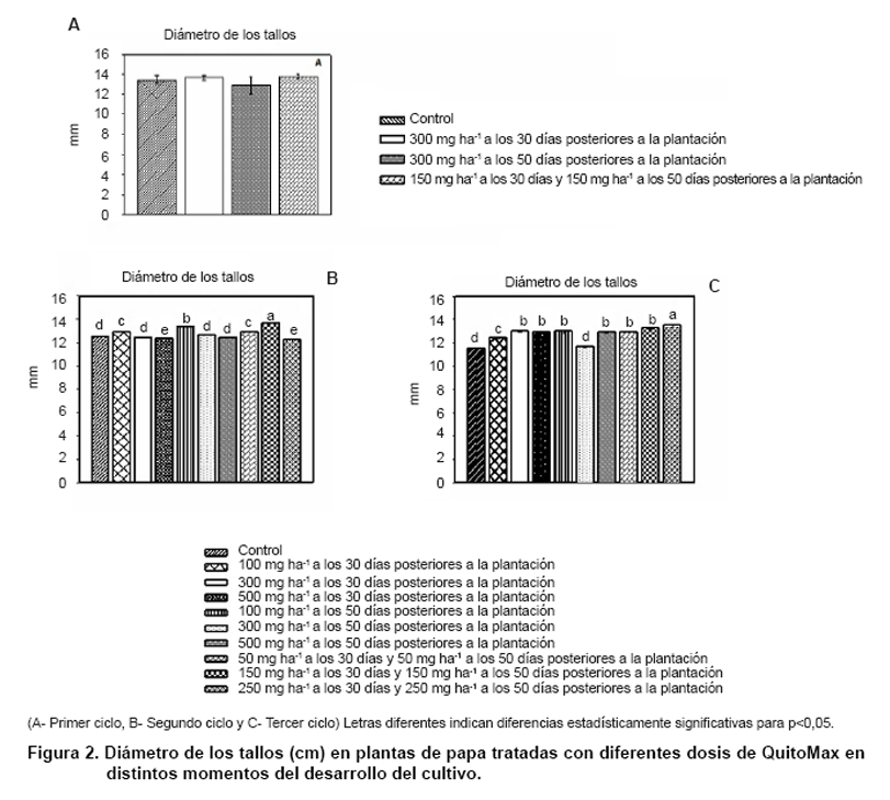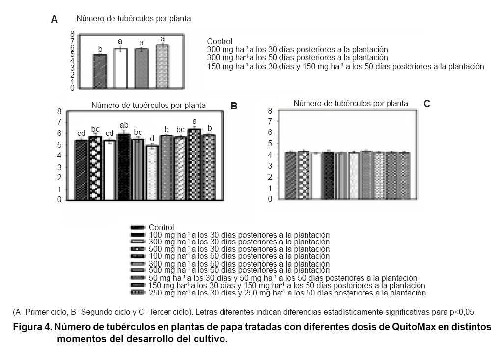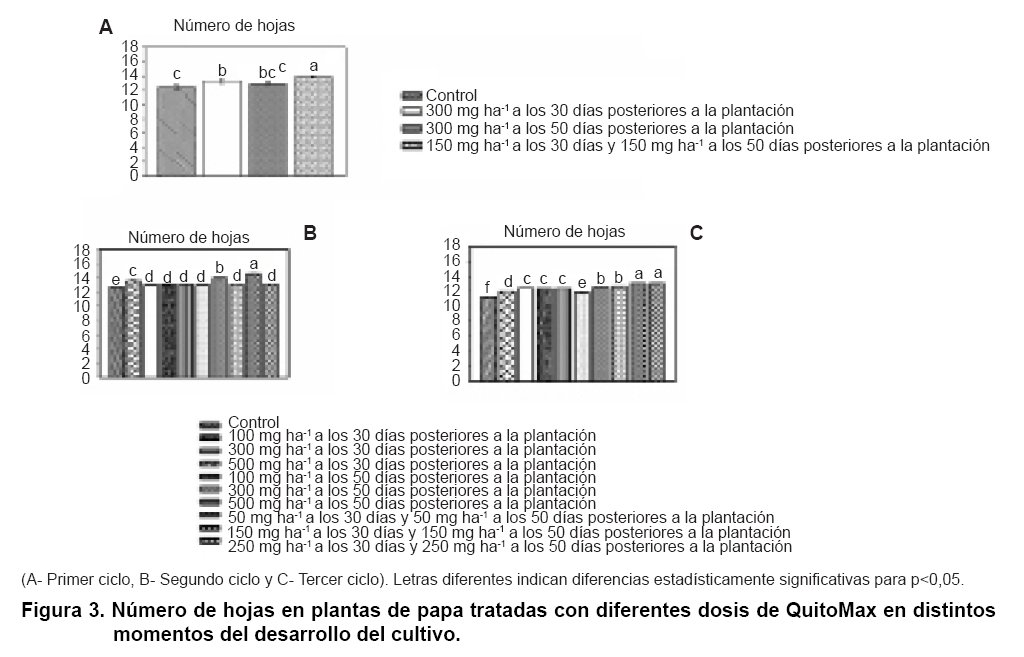 The aim of this work was to evaluate some components of the growth and yield in potato plants (Solanum tuberosum L.) previously treated by foliar spray with different doses of QuitoMax (bioproduct based on chitosan polymers) at two moments of crop development. The work was conducted over three crop cycles (2009-2010, 2010-2011 and 2011-2012). At first cycle, besides the control where the product was not applied, three QuitoMax treatments were sprayed. A dose of 300 mg ha-1 at 30 or 50 days after planting and another treatment in which two doses of 150 mg ha-1 were applied at 30 and 50 days after planting. In the following two cycles in addition to control, nine treatments at doses of 100, 300 and 500 mg ha-1 at both 30 and at 50 days after planting were applied, another three treatments where doses of 50, 150 and 250 mg ha-1 were applied at the two moments above mentioned. The variables studied were the length and diameter of stems, number of leaves and tubers per plant, the average tubers fresh weight and the percentage of dry mass. Yields were estimated based on tuber fresh and dry masses. The analysis of the results showed the best response when the plants received two QuitoMax applications, highlighting the dose of 150 mg ha-1, which caused a superior yield increment of 15 % in relation to control no applied.