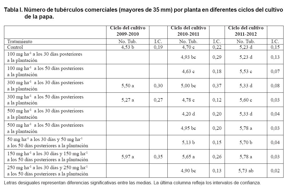 El objetivo del trabajo fue evaluar algunos componentes del crecimiento y el rendimiento en plantas de papa (Solanum tuberosum L.) sometidas a la aplicación foliar de diferentes dosis de QuitoMax (bioproducto a base de polímeros de quitosano) en dos momentos del desarrollo del cultivo. El trabajo se realizó durante tres ciclos del cultivo (2009-2010; 2010-2011 y 2011-2012). En el primer ciclo se contó con cuatro tratamientos en los que, además del control en el que no se aplicó el producto, se utilizaron dos en los que se empleó una dosis de 300 mg ha-1 a los 30 o a los 50 días posteriores a la plantación y otro en el que se aplicaron dos dosis de 150 mg ha-1una a los 30 días y la otra a los 50 días posteriores a la plantación. En los dos ciclos siguientes se contó además del control, con nueve tratamientos en los que se aplicaron dosis de 100, 300 y 500 mg ha-1, tanto a los 30 como a los 50 días posteriores a la plantación y otros tres en los que se aplicaron 50, 150 y 250 mg ha-1 en los dos momentos antes señalados. Las variables evaluadas fueron la longitud y diámetro de los tallos, el número de hojas por planta, el número de tubérculos por planta, la masa fresca promedio de los tubérculos y su porcentaje de materia seca. Se estimaron los rendimientos en base a las masas fresca y seca de los tubérculos. El análisis de los resultados mostró una mejor respuesta de las plantas cuando recibieron dos aplicaciones de QuitoMax, destacándose el tratamiento en el que las plantas recibieron 150 mg ha-1, el que provocó un aumento del rendimiento superior a un 15 % en relación al control no aplicado.