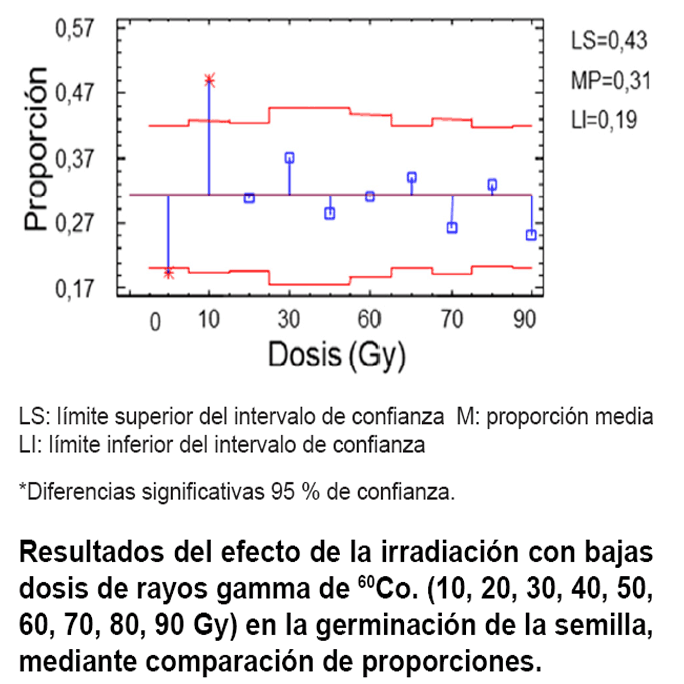Semillas de Stevia rebaudiana, cultivar KH-IAN VC-142 (Eireté), se irradiaron en el Centro de Aplicaciones Tecnológicas y Desarrollo Nuclear (CEADEN), con rayos gamma de 60C0 en un irradiador MPX25, con una tasa de dosis de 0,517 kGy/h. Se utilizaron dosis entre 10 y 90 Gy con intervalos de 10 Gy. Las semillas irradiadas, así como el control sin irradiar, se colocaron en placas petri con papel de filtro humedecido con agua destilada y al cabo de los 15 días se evaluó el número de semillas germinadas. Se emplearon 100 semillas por tratamiento. Para determinar las diferencias entre los tratamientos se utilizó el método de comparación de proporciones por muestras independientes.