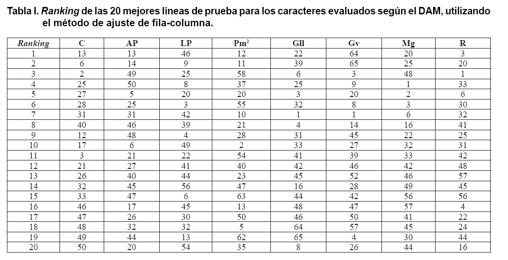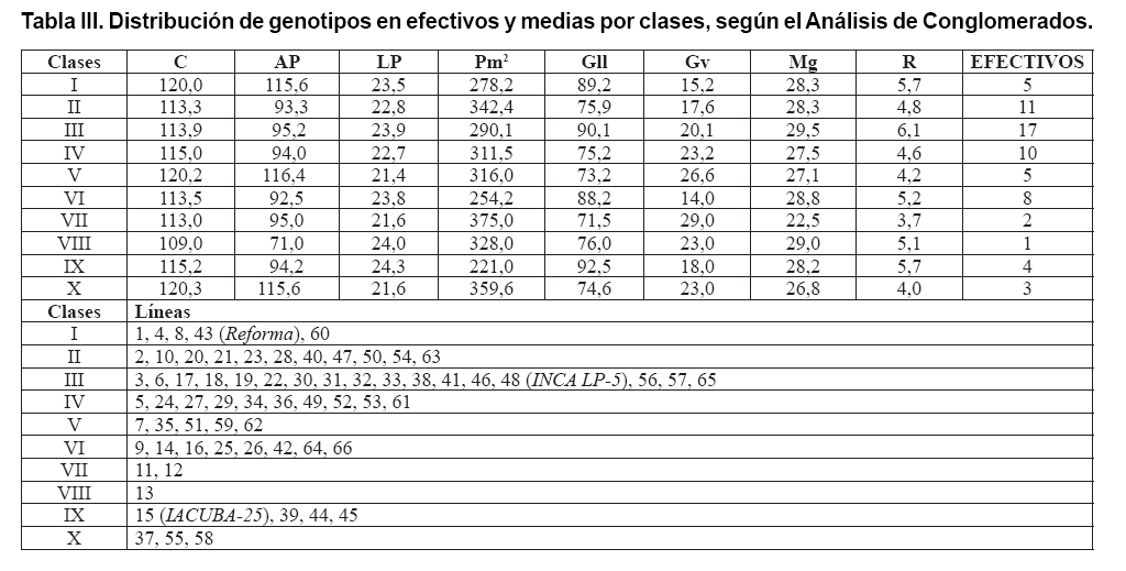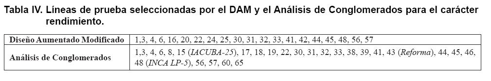De manera general, la combinación de las técnicas estadísticas empleadas: DAM y Análisis de Conglomerados, posibilitó la selección de 27 líneas promisorias, que se sugiere, sean incluidas en estudios superiores del Programa de Mejoramiento Genético para completar su caracterización y evaluar su resistencia a plagas. Además, el modelo propuesto por el análisis de regresión lineal múltiple permite, a través de los coeficientes estimados, expresar el cambio esperado de la variable dependiente rendimiento para cada unidad de cambio de las variables independientes estudiadas.