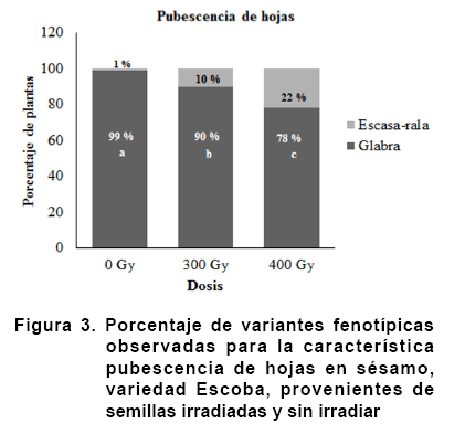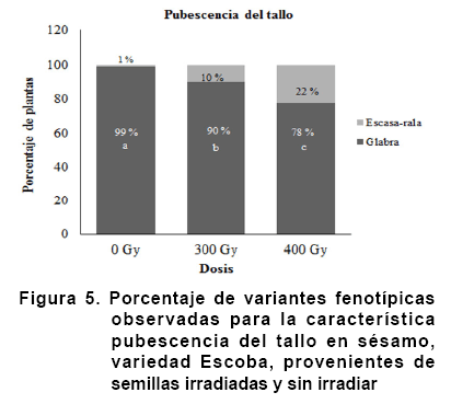 Mutation induction has been used in breeding programs to produce genetic variability. The objective of the research was to evaluate the phenotypic variation induced by gamma radiation in sesame seeds. The experiment was carried out in the experimental field of the Agricultural Sciences Faculty in the National University of Asunción, between October 2013 and February 2014. Seeds used corresponded to the M1 generation, from Escoba cultivar. Completely randomized design was used, with three treatments 0, 300 and 400 Gy, respectively, and twenty five repetitions, randomly selected within the field crop, with eight plants each one. The variables evaluated were: color, pubescence and position of leaves, stem color at maturity, pubescence and type of branching, density of pubescence and dehiscence of capsules, color and texture seed, morphological traits used as varietal descriptors. International Sesame descriptor was used for the characterization of each variable. The data for all variables were subjected to analysis of variance and Tukey test at 5 % probability of error. Variables that showed statistically significant differences for all treatments were: color, position and leaf pubescence, color at maturity, pubescence branching type and capsules pubescence. For dehiscence of capsules, color and texture of the seeds coat were not observed statistical differences. It was concluded that for the morphological traits gamma radiation treatments at doses of 300 and 400 Gy, is effective as a method of mutation induction and generation of phenotypic variability in sesame seeds.