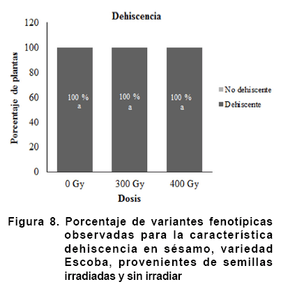 Para la característica dehiscencia de las cápsulas, no fue posible realizar el análisis de varianza por que al llegar a la etapa de maduración en todos los tratamientos evaluados las plantas presentaron cápsulas dehiscentes (Figura 8). Los trabajos reportados coinciden en que la dehiscencia de cápsulas en el campo es característica de la variedad Escoba, característica que en este ensayo no fue modificada por los tratamientos con irradiación de 300 y 300 Gy (10, 12, 13). Utilizando 600 Gy, de un total de 85 plantas, fueron observadas dos plantas que presentaron indehiscencia y 13 de ellas resultaron con semi-indehiscencia de cápsulas (8).