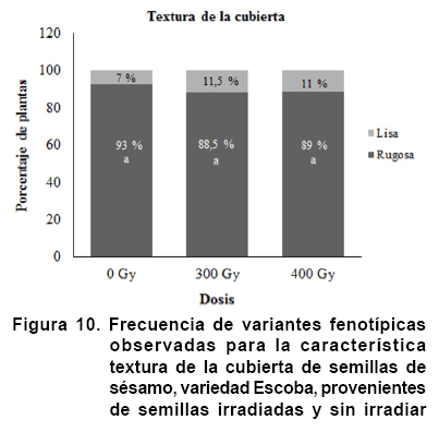 En relación a la textura de la cubierta de las semillas, la textura rugosa fue observada en 97 % de las plantas del testigo sin irradiar y 88,5 y 89,1 % de las plantas provenientes de semillas irradiadas con 300 y 400 Gy respectivamente, no habiendo diferencias significativas entre los tratamientos (Figura 10). Las semillas de la variedad Escoba han sido caracterizadas con cubiertas de textura lisa en algunos trabajos (10) y, con textura rugosa en otros de acuerdo a los descriptores varietales utilizados (11, 13). Por otro lado, el patrón de rugosidad se modifica conforme el momento de la cosecha. De manera que, en un mismo lote de semillas es posible observar diferentes patrones de textura de la cubierta. Si bien, el color de la semilla es gobernada por otros genes, la textura del tegumento tiene influencia sobre el mismo, semillas con textura rugosa tienen tonalidades más oscuras que las semillas de textura lisa (15).