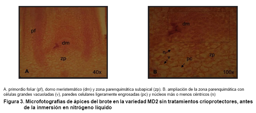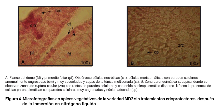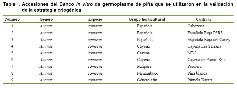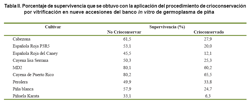 En la piña se han utilizado protocolos de crioconservación basados en un procedimiento de vitrificación. Sin embargo, se desconoce aún la influencia de algunos factores técnicos para lograr una estrategia criogénica con una aplicación de rutina a un amplio número de genotipos. Además hasta la fecha, no se han realizado ningún análisis histológico para visualizar cambios estructurales durante un procedimiento de crioconservación. En la presente investigación se determinaron diferentes aspectos técnicos de una estrategia criogénica para aumentar los niveles de supervivencia de los ápices a la inmersión en nitrógeno líquido. Estos fueron: tipo de ápice, compuesto por 3-4 primordios foliares con un tamaño aproximado de 2,5-3mm; precultivo en 0,3 mol L-1 de sacarosa; aplicación de la solución de carga 0,4 mol L-1+2 0,4 mol L-1 glicerol; temperatura de aplicación de la solución vitrificadora PVS2 a 0 °C durante 420 min. El análisis de la visualización de los cambios estructurales ocurridos en los ápices crioconservados reveló que las células meristemática presentes en el domo apical y los primordios foliares en formación, sufrieron pocas alteraciones celulares y mantuvieron casi intacta sus características morfo-fisiológica en las mejores condiciones de supervivencia. Se aplicó de manera exitosa un procedimiento de vitrificación para nueve accesiones del banco de germoplasma in vitro del centro de Bioplantas. Lo anterior constituye una importante etapa para el establecimiento de un banco de germoplasma a larga plazo del cultivo de la piña.