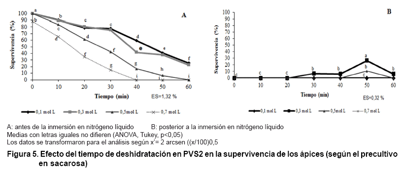 0,1; 0,3; 0,5 y 0,7 mol L-1 de sacarosa, para mejora de la supervivencia