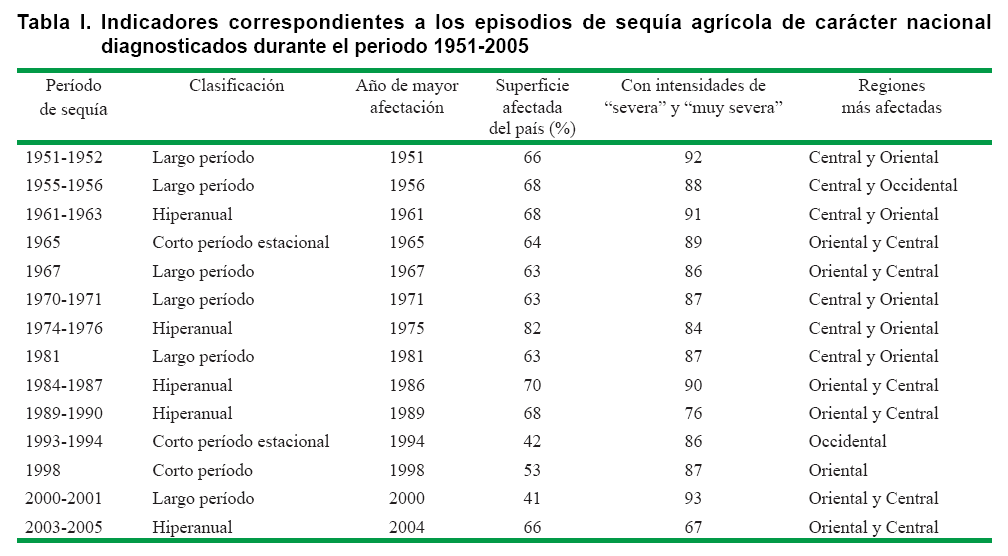 En la Tabla I se exponen algunos indicadores de la sequía agrícola (5), con los cuales pueden ser comparados los diferentes episodios identificados en las distintas regiones del país (9).