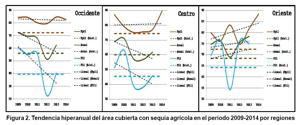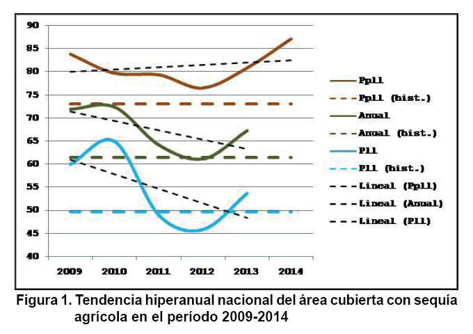 Específicamente en el período comprendido entre 2009 y 2014, cabe señalar, de acuerdo con un estudio realizado por especialistas del Centro de Meteorología Agrícola del Instituto de Meteorología (INSMET)R, cuál fue la tendencia hiperanual del área cubierta con sequía agrícola en el país. El autor ha destacado que, a pesar de que al cierre del 2013 el país presentaba el 67 % del área afectada con presencia de sequía agrícola, la tendencia desde el 2009 es a su disminución; lo mismo sucede en el período lluvioso (Pll), cuya tendencia también es a la disminución; no obstante, en el período poco lluvioso (Ppll) se invierte el comportamiento, cerrando en 2014 con un área afectada del 81 %, representando el 9 % del país más afectado respecto a la sequía de 2009-2010 (Figura 1)S.