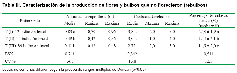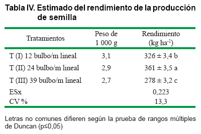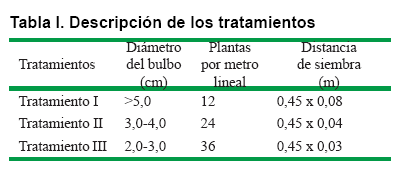 En la Tabla IV se muestran los rendimientos alcanzados por cada tratamiento en la unidad experimental, manifestándose diferencias significativas entre los tres. Se destacó el tratamiento que utilizó bulbos entre 3,0 y 4,0 cm de diámetro como material de plantación y una densidad de plantación de 24 bulbos por metro lineal que superó de 1,1 a 1,3 veces al resto de los tratamientos, que equivale a un incremento de la producción de 35 a 83 kg ha-1.