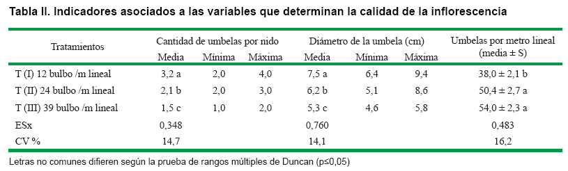 En la Tabla II se muestra que existen diferencias significativas entre los tres tratamientos, en cuanto a la cantidad de umbelas por nido, se destaca el tratamiento (I) con los bulbos de mayor diámetro que superó de 1,52 a 2,13 veces al resto de los tratamientos. Esta tendencia también se manifiesta en el diámetro de la inflorescencia, donde los resultados indican que también existen diferencias significativas entre los tres tratamiento y sobresale el tratamiento (I), donde el diámetro de la umbela fue de 1,2 a 1,6 veces mayor que resto de los tratamientos. También se destaca que los tratamientos donde se utilizaron los bulbos de menor tamaño (II y III) difieren significativamente del (I); no así entre ellos, superándolo de 1,3 a 1,4 veces la cantidad de umbelas por metro lineal, indicador que constituye un elemento básico para el rendimiento. Es decir, a pesar de que el tratamiento (I) tiene mayor cantidad de umbelas por nido y mayor diámetro de la inflorescencia en los otros dos tratamientos, se muestra el efecto que ejerce el diámetro del bulbo y la densidad de siembra que inciden directamente en la cantidad de umbelas por unidad de superficie. Resultados similares fueron obtenidos por diferentes autoresC (6, 12), este último en condiciones de Topes de Collantes en el municipio de Trinidad en Sancti Spíritus, Cuba.
