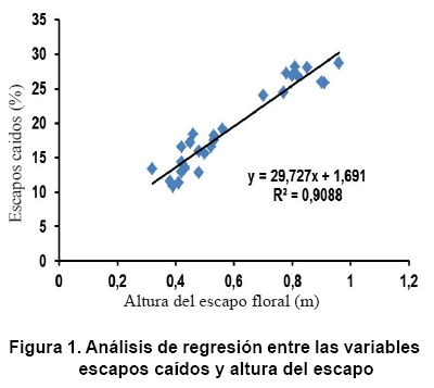 En la estimación curvilínea de regresión (Figura) entre la cantidad de escapos florales caídos como variable dependiente y la altura del escapo floral como independiente, se encontró que el modelo que más se ajustó es el lineal, con tendencia positiva muy fuerte, para una probabilidad calculada de 0,001 y un coeficiente de correlación Pearson (r=0,95), donde se refleja el alto grado de asociación lineal del conjunto de datos, correspondiente a observaciones de variables continuas y una significación de 5 %. La tendencia creciente indica que la caída del escapo floral varía 29,72 % por cada unidad de variación de la altura del escapo.