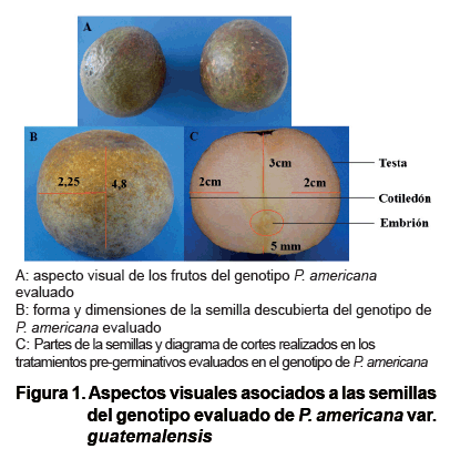 La semillas del genotipo de P. americana var. guatemalensis evaluado fue del tipo adherida, cuya masa fue bastante variable con valor promedio de 0,040 kg ±0,0258, densidad de 2* 10-4 kg m-3 ± 0,0001, forma de tipo oblata, 0,048 m ± 0,04 de altura, diámetro 0,022 m ± 0,03, humedad promedio de 47,06 % ± 10. Testa de color castaño claro de 1 *10-4 m de grosor, cotiledónes hemisféricos, lisos y de color crema (Figura 1 B y C).