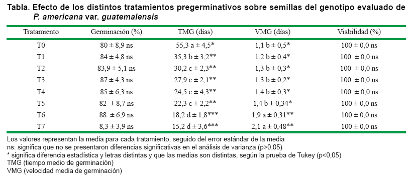Los tratamientos pregerminativos, al igual que el almacenamiento de las semillas, afectaron las viabilidad, velocidad de germinación, el tiempo medio de germinación y el porcentaje de germinación del genotipo de P. americana var. guatemalensis. Para este genotipo particular el tamaño óptimo de la semilla fue aquel con una masa de 40-50 g.