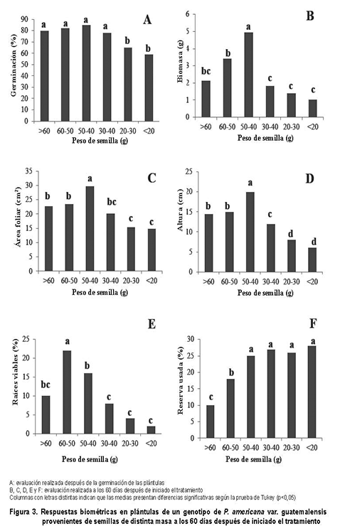 Por su parte el análisis estadístico para la biomasa agrupó los resultados en cuatro grupos distintos (p<0,05), dando lugar a que la mayor biomasa se presentara en semillas provenientes de masas entre 40-50 g, seguido de 50-60 g, en un grupo intermedio aquellos de masas >60 g y en el nivel inferior las plántulas provenientes de semillas con masa <40 g (Figura 4 C).