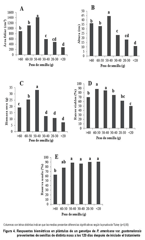 La destrucción de las unidades experimentales al día 120 (Figura 4), mostró una tendencia similar a la encontrada en el día 60, donde sobresalió un patrón o tendencia, la cual se caracterizó porque las plántulas provenientes de semillas de masas inferiores a 30 g, el desarrollo fue estadísticamente menor (p<0,05) con respecto a las semillas de masa superior a 40 g. Esta tendencia dio lugar a que el área foliar y la altura se separen en tres grupos, el primero y con valores más altos con respecto a los demás (p<0,05), agrupó las semillas de masa entre 40-50 g, con valores intermedios las masas superiores a 50 g y en el grupo con los niveles inferiores las semillas de masa inferior a 40 g (Figura 4 A-B).
