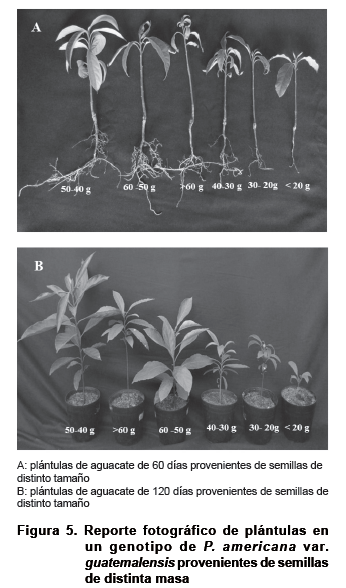 En este trabajo se encontró que los tratamientos germinativos y el tiempo de almacenamiento, afecta la germinación, la viabilidad y la velocidad de germinación de semillas de un genotipo de P. americana var. guatemalensis. Por su parte el uso de semillas de baja masa (<30 g), da como resultado plántulas de escaso desarrollo (Figuras 3, 4 y 5). Para el caso de las semillas de mayor masa (> 50 g), estas dan origen a plántulas con un desarrollo más lento, dando lugar a que bajo condiciones de producción comercial los tiempos en vivero sean más largos.