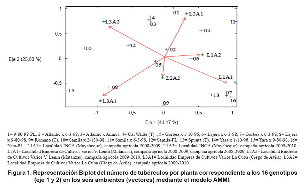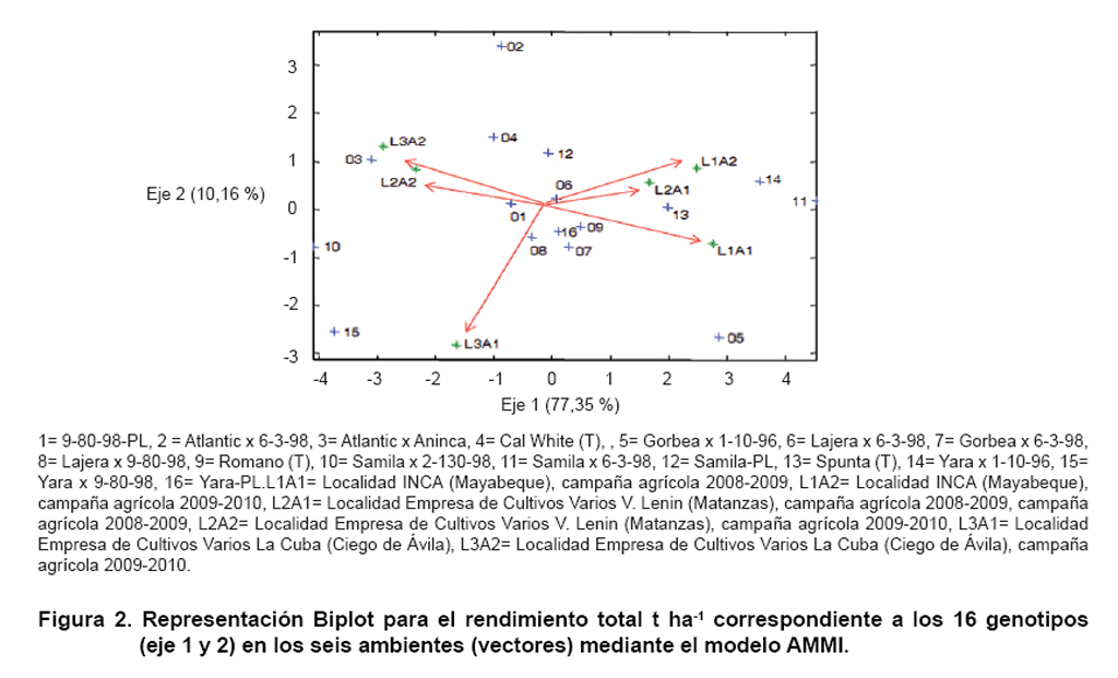 During crop years 2007-2008 and 2008-2009 at three locations ( National Institute of Agricultural Sciences-Mayabeque , Agricultural Enterprise “V. Lenin”-Matanzas and Agricultural Enterprise “La Cuba”-Ciego de Ávila), 13 progenies from seedling tubers were evaluated and three witnesses varieties (Romano, Spunta and Cal White). Number of tubers per plant, yield per hectare (t ha-1) and incidence of spots on the foliage by the fungus Alternaria solani Soraeur were recorded. The data were processed by analysis of variance, and adjusted with additive main effects and multiplicative interaction model (AMMI) to the characters which was significant genotype environment interaction was adjusted. The sexual progeny Lajera x 6-3-98 were stable for tuber number and yield in six environments studied. The Lajera x 6-3-98, Lajera x 9-80-98, progenies were stable for yield and average tuber mass in the six environments studied. The progeny Samila x 2-130-98, Yara x 1-10-96, Yara x 9-80-98, Atlantic x Aninca y Samila x 6-3-98, were the most unstable for the three studied traits but specific adaptation in each locality. These contrasts in the agronomic performance of the progeny of sexual seed suggest the need to evaluate the materials in each production area.